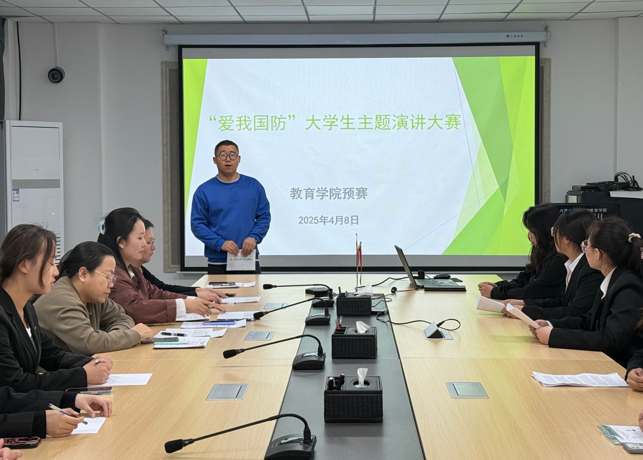 为深入学习领会党的二十大和二十届三中全会精神,贯彻落实习近平强军思想,不断增强国防教育的感召力和覆盖面,着力提升青年学生的国防意识和国防素养,大力营造支持国防建设、 热爱人民军队的校园文化氛围,4月8日,我院在A406会议室举办“爱我国防”大学生主题演讲比赛。开云篮球体育党委副书记、副院长斯琴满都呼,学生工作与就业办公室胡建芳、乌亚汗、马德广老师参加并担任评委,比赛由马德广老师主持。